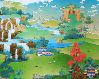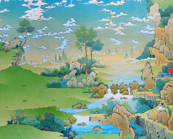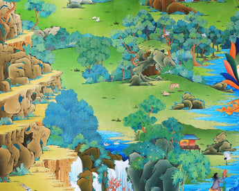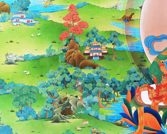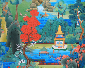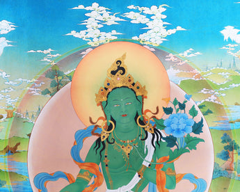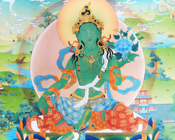 A beautiful Green Tara thangka print. In a lavish open background, we have tried to show Mother Tara in the grandeur form. The vast background with Mother Tara at the center makes the painting enormously beautiful. This painting is truly exquisite.
