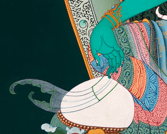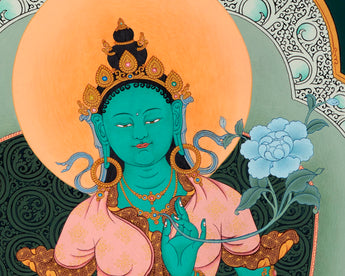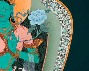 Green Tara has green skin, and she has a specific posture that distinguishes her from other Tara and other female deities. Her right hand is giving mudra of generosity and her left hand is holding a fully bloomed blue lotus flower in the thangka.