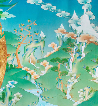 A large size beautiful Green Tara thangka painting. In a lavish open background, we have tried to show Mother Tara in the grandeur form. The vast background with Mother Tara at the center makes the painting enormously beautiful. This painting is truly exquisite.