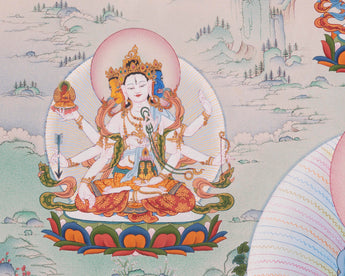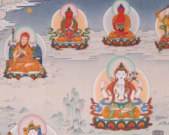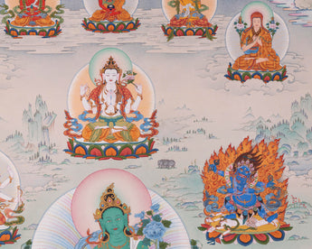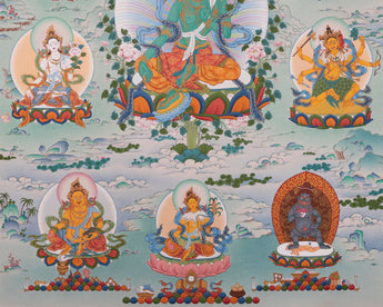 The Thangka portrays Green Tara with Buddhas and Bodhisattvas with mother nature beneath colorful clouds. Green Tara is painted at the center, making her visible at first sight. Above her vibrant Halo is Chenrezig. On her left are Vajrapani and Parnashavari; to the right are Usnisavijaya and white tara. Below from right to left are Dzambala, Vasudhara, and Black Dzambala. Above Chenzerig, from left to right, are Sakya Pandita, Amitayus, Amitabha, Manjushri, Ngorchen Kunga Zangpo. Every Deity has its attributes and nature.