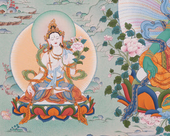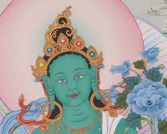 In the Thangka, along with the Green Tara, there are Manjushree, White Tara, Dzambala, and many others. The practice of White Tara is performed for any health-related issues. Tara is a meditation deity worshiped by practitioners of the Tibetan branch of Vajrayana Buddhism to develop certain inner qualities and to understand outer, inner, and secret teachings such as karuṇā (compassion), mettā (loving-kindness), and shunyata (emptiness).