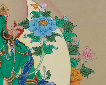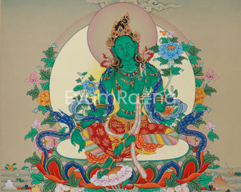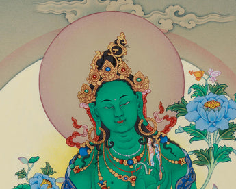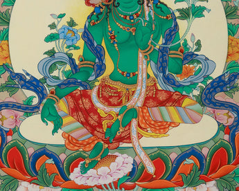 The Canvas print of Jetsun Drolma (Green Tara), a timeless representation of the cherished Buddhist goddess renowned for her limitless compassion and swift action, will enhance your sacred space. The intricate details and vibrant colors of traditional Tibetan thangka painting are masterfully captured in this exquisite giclée canvas. The artwork fosters a deep connection to the divine energy of Green Tara, the Mother of Liberation, whether you're seeking spiritual inspiration or simply wish to appreciate the beauty of Buddhist art.