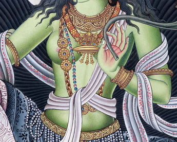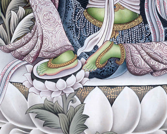 The magnificent Green Tara thangka digital print is a heavenly creation that honors the Green Tara Buddha Mantra Practice and depicts the goddess of compassion and action. The emerald-green skin of Green Tara, who has the power to fulfill wishes and exude calm beauty, is depicted in print. Green Tara's physical features, which include a crown, jewels, and flowing clothing, represent her spiritual strength and kind character. The mandala and lotus blossoms, among other minute elements, give the picture depth and significance. This digital print is a beautiful addition to any spiritual practice or home décor collection. It provides a route to inner calm, enlightenment, and a holy reminder of the goddess' significance.