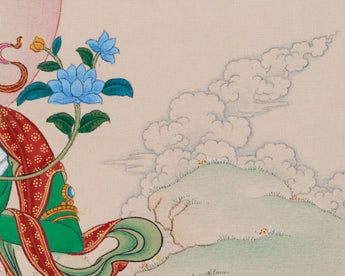 Our elegant 33 cm Green Tara painting, made in our Enlightenment Studio with natural stone colors and adorned with genuine 24K gold, is a stunning piece. Created in the traditional Karma Gadri style, this thangka features a spacious composition, soft landscapes, and intricate detailing that showcase Tara’s radiant presence. The natural pigments ensure a lasting vibrancy, while the gold accents add a divine glow, making this artwork both spiritually meaningful and visually stunning.