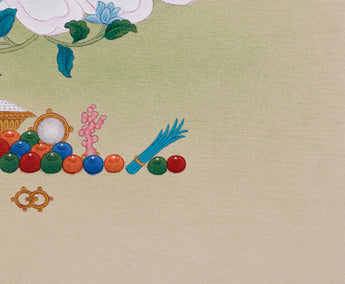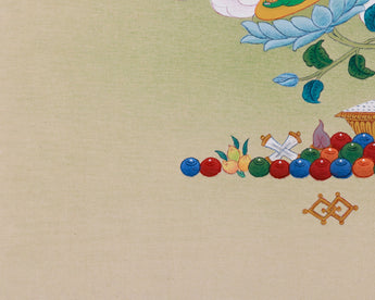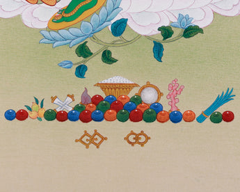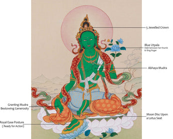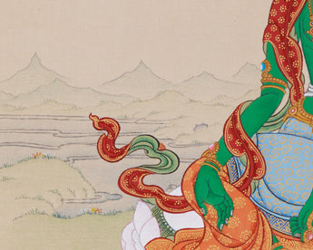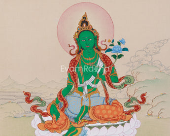 Green Tara, a highly revered female deity in Tibetan Buddhism, is known as the swift liberator and embodiment of active compassion. She's often called the "Mother of All Buddhas" and is invoked for protection against fear, obstacles, and suffering. This 33 cm Green Tara painting shows her sitting gracefully on a lotus throne, with her right leg extended, signifying her readiness to help those in need. Her right hand represents generosity, while her left hand holds a blooming lotus, symbolizing purity and spiritual growth. Every detail of this thangka conveys her nurturing strength, offering blessings of courage, compassion, and swift protection.