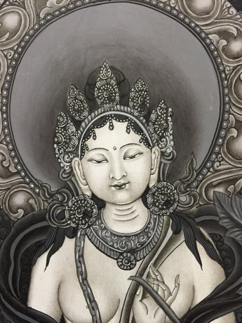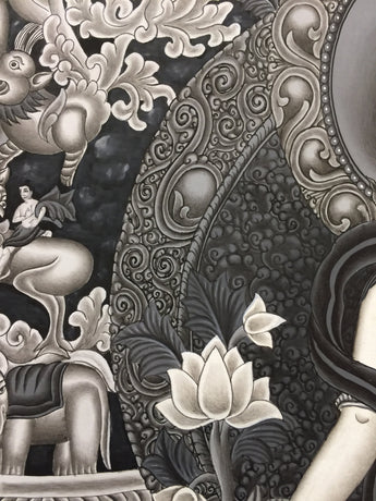 In this painting Green Tara is seated in a playful posture. Her right hand is in the Varadamudra because she is quick to respond to the petitions of those who seek her aid. She is adorned with five jewels symbolizing the Dhyani Five Buddhas . In both her hands she is holding Utpala flowers, symbolizing her purity. Her color is green because her Bodhisattva activity is swift like the wind element. On the bottom part of the painting Manjushree and Vajrapani is portrayed in devotional postures. They gaze at the deity eagerly as if they are making a petition to protect the world. Buddha Aparmita is seen on the top Centre panel of the painting. The artist has placed the whole in a beautiful surrounding landscape of forest, brooks, and mountains. A light brown sky on the background has added profundity to the message of the painting.
