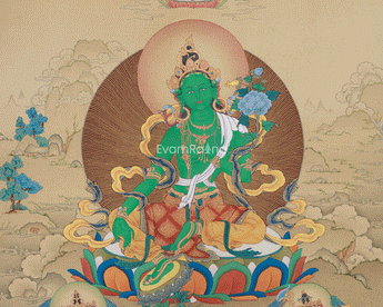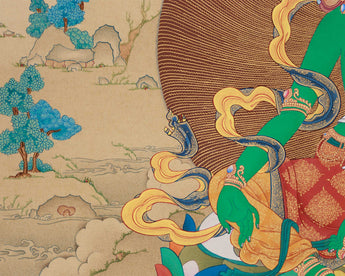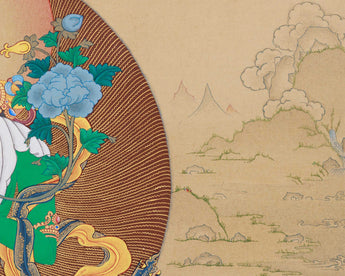 Explore this breathtaking hand-painted thangka of the Himalayan Buddhist Goddess Green Tara, the Compassionate Goddess, a true masterpiece of Tibetan artwork. Amitabha Buddha, Namgyalma, and Parnashavari accompany her. Created with natural Lhasa stone colors, cotton canvas, and 24K gold, this artwork embodies the traditional Karma Gadri style, blending Tibetan Buddhist heritage with high-quality materials. Gold detailing and vibrant stone pigments make a piece that radiates divine energy and timeless beauty.