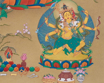 Each figure in this thangka is thoughtfully painted with intricate detail, capturing the deep symbolism and spiritual significance behind these deities. The rich textures and colors not only honor Tibetan Buddhist traditions but also serve as a meaningful addition to any sacred space, promoting peace and harmony in your home or meditation room.