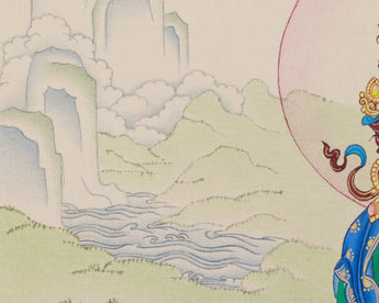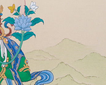 In this artwork, Green Tara is depicted elegantly seated on a blooming lotus throne, with her right hand in the varada mudra (gesture of granting blessings) and her left hand holding a blue lotus flower, symbolizing purity. The bright gold accents on her crown and robes highlight her divine presence, while the serene mountain and cloud backdrop reflect her calm and compassionate energy. More than just a thangka, it serves as a spiritual guide, inviting blessings of compassion, wisdom, and healing into your life. Place this sacred thangka in your home or meditation space to invoke Tara's energies of peace, protection, and spiritual growth.