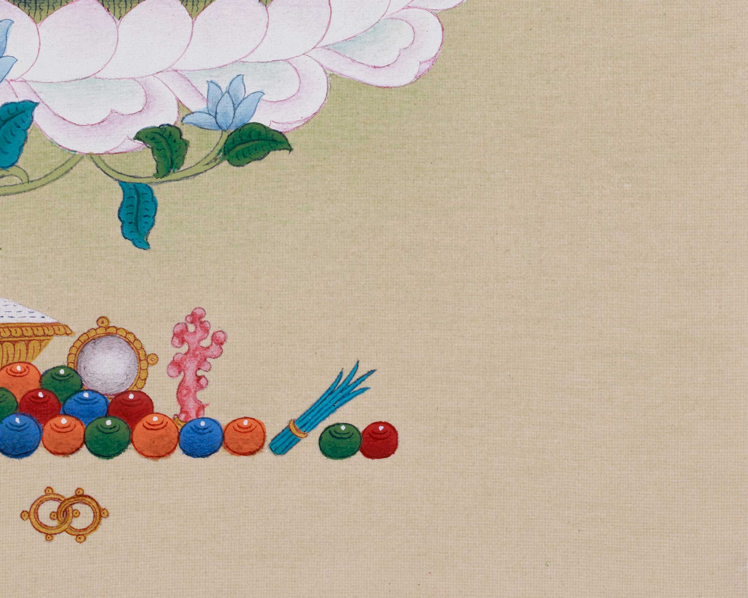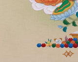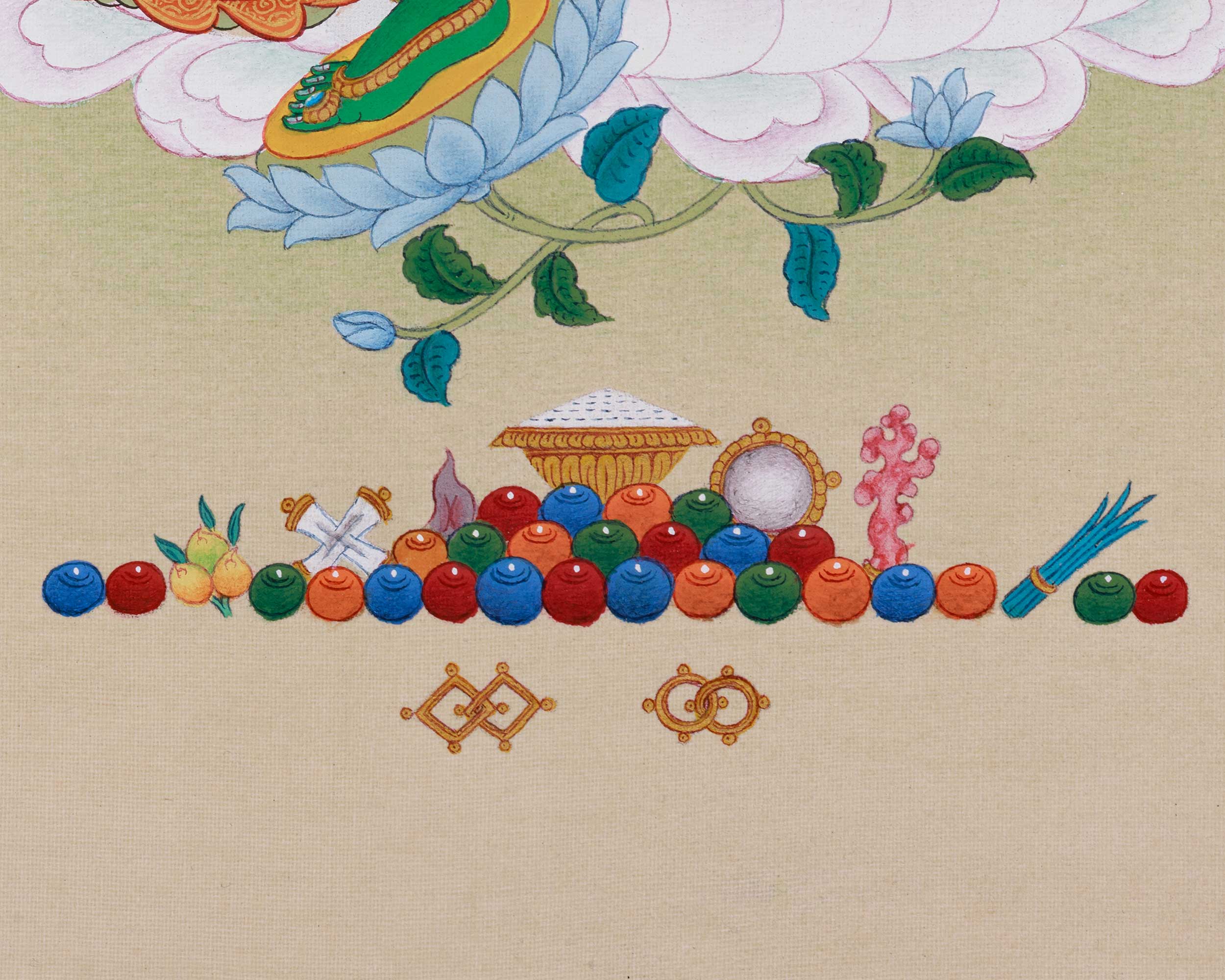 This thangka is made from high-quality cotton canvas, which allows for breathability and promotes longevity. Gold accents emphasize sacred elements such as halos, crowns, and jewelry. The colors are derived from natural stone pigments that have been used in Tibetan art for centuries, resulting in vibrant, durable hues applied to her skin, clothing, and floral motifs. Executed in the traditional Karma Gadri style, renowned for its delicate line work and realistic portrayals, it accentuates facial features, postures, and divine attributes through subtle shading to create depth and realism.