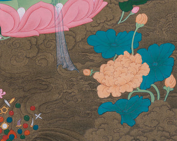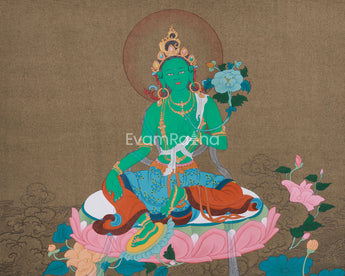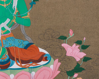 Traditional Green Tara Thangka beautifully portrays Tara's compassionate and protective nature, honoring one of Tibetan Buddhism's most revered bodhisattvas. This Thangka is hand-painted with high-quality acrylic colors, capturing the vibrant details and profound symbolism of traditional Tibetan art. The artwork is created on cotton canvas, offering a sturdy base for the intricate designs. Additionally, genuine 24K gold is applied in certain areas to boost the piece's sacredness and shine. The thangka, painted in the classic Karma Gadri style, showcases detailed deity portrayals, reflecting both artistic skill and spirituality devotion.