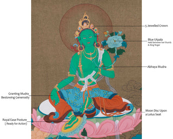 The artwork depicts Green Tara, the "Mother of all Buddhas" in Tibetan Buddhism, in a Royal Ease stance, symbolizing her loving nature and readiness for action. The moon disc and lotus seat represent purity, wisdom, and spiritual growth. The thangka highlights her 5-Jeweled Crown, symbolizing transcendent wisdom and power, and her right-hand Abhaya Mudra, signifying reassurance and fearlessness. The blue utpala flower, held between her thumb and ring finger, symbolizes purity, wisdom, and the power to cleanse suffering. The artwork employs intricate symbolism to illustrate Tara's readiness to act swiftly and protectively for all sentient beings.