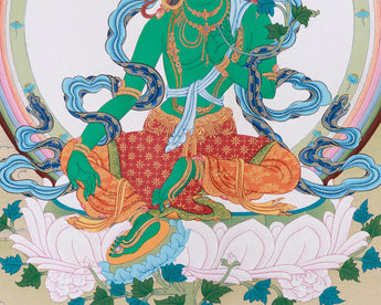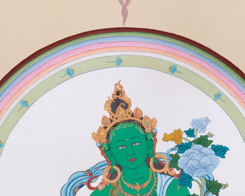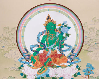 Experience the divine energy of Tara like never before with this uniquely hand-painted Green Tara Protection Deity Thangka. It uses natural stone colors on high-quality cotton canvas, beautifully accented with genuine 24K gold. Unlike traditional Thangkas, this artwork features a unique style that offers a fresh and rare perspective of Green Tara. The natural stone pigments and gold accents add vibrancy and realism to the artwork while also increasing its spiritual value, making it a meaningful and valuable piece for any collection.