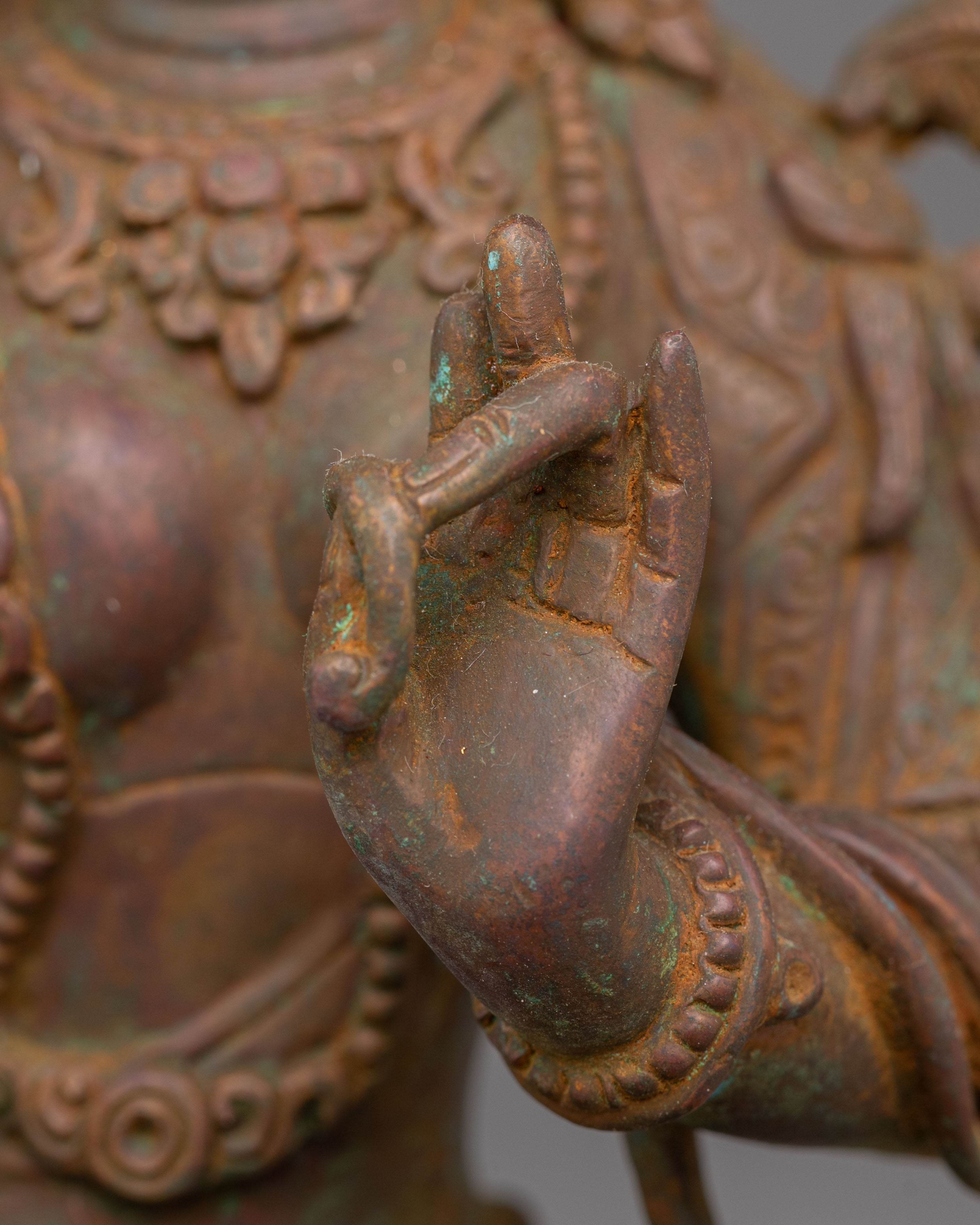 As depicted, Green Tara is shown seated on a lotus throne with her right leg typically extended forward, signifying her active compassion and willingness to help. Her hands express profound meaning through their gestures; the right hand is displayed in the "gesture of giving" (Varada Mudra), symbolizing her boundless generosity and willingness to provide blessings. Meanwhile, her left hand delicately holds a blue lotus (Utpala), a symbol of purity and spiritual awakening, offering protection and reassurance to those who seek her guidance.