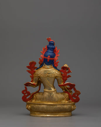 As depicted, Green Tara is shown seated on a lotus throne with her right leg typically extended forward, signifying her active compassion and willingness to help. Her hands express profound meaning through their gestures, the right hand is displayed in the "gesture of giving" (Varada Mudra), symbolizing her boundless generosity and willingness to provide blessings. Meanwhile, her left hand delicately holds a blue lotus (Utpala), a symbol of purity and spiritual awakening, offering protection and reassurance to those who seek her guidance.