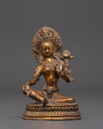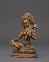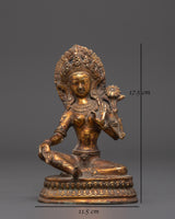 This Green Tara Goddess Buddhism Statue is a stunning representation of compassion, protection, and enlightened activity. Standing 17.5cm tall and 11.5cm wide, and weighing 0.94kg, this sacred figure embodies both grace and spiritual power. Handcrafted from an oxidized copper body and elegantly gold plated, the statue captures the perfect balance between antiquity . The soft, aged patina of the oxidized finish contrasts beautifully with the golden highlights, enhancing the visual depth of the sculpture. Each feature—from the serene expression to the intricate lotus base—is carefully shaped to reflect the divine presence of Tara, the revered female Bodhisattva in Tibetan Buddhism.
