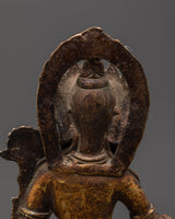 The artisan’s craftsmanship gives life to every detail: Tara’s crown, her flowing robes, and the open lotus beneath her hand are delicately engraved and polished with care. The gold-plated embellishments highlight her divine aura, symbolizing enlightenment and purity. The oxidized copper base provides a grounding presence, representing stability and the deep roots of Buddhist tradition. This statue is more than an artistic creation—it is a spiritual object meant to inspire meditation, devotion, and peace. Whether placed on an altar, shrine, or meditation corner, it radiates an energy of compassion and calmness that enriches any sacred space.