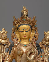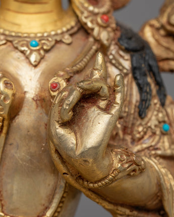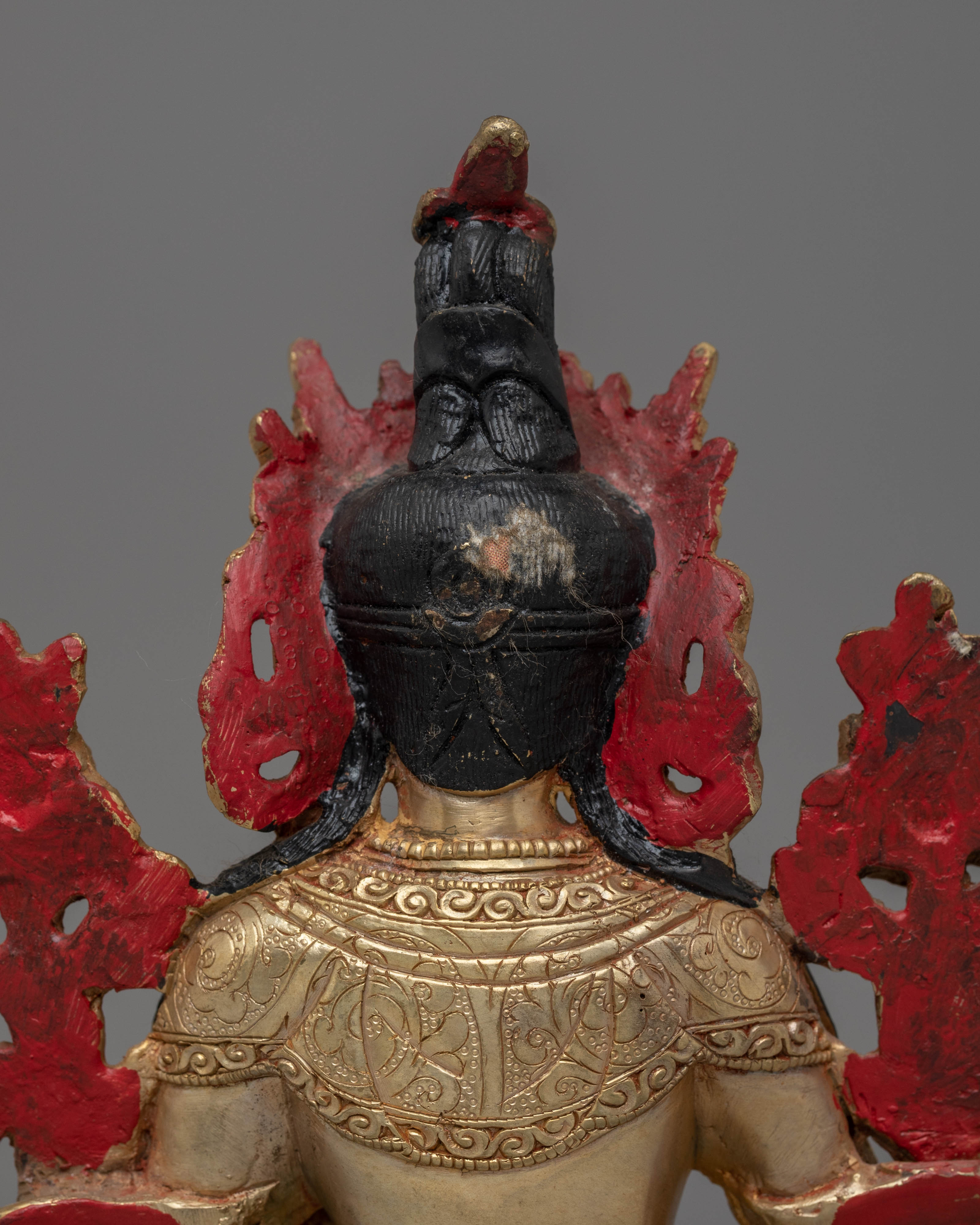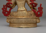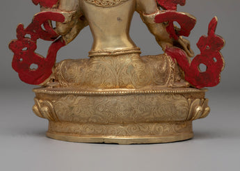 The Green Tara Handcrafted Copper Statue is a stunning representation of Tara, the female Bodhisattva of compassion, known for her swift assistance and healing powers. Standing at 22 cm in height and 18 cm in width, and weighing 1.65 kg, this beautifully crafted statue is made from a copper body and enhanced with 24K gold gilding. The addition of turquoise and coral artificial stones highlights the vibrant beauty and spiritual significance of the piece. This statue embodies the qualities of compassion, protection, and the power to overcome obstacles, making it an ideal addition to any altar or meditation space.