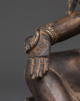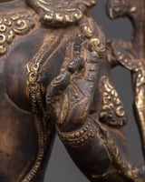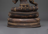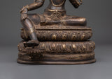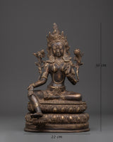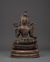 Shyama Tara, honored for her deep compassion and protective nature, is depicted seated with her right leg extended, symbolizing her readiness to help others. In her right hand, she holds a lotus, representing purity and spiritual growth, while her left hand forms the Three Jewel Mudra, honoring the Buddha, Dharma, and Sangha, and also carries a lotus symbolizing continuous spiritual progress. She wears a crown adorned with the Five Dhyani Buddhas, representing the five facets of enlightened wisdom. Resting on a lotus base with a moon disc, her serene yet engaged posture highlights her role as a caring guide. The intricate craftsmanship of the statue beautifully captures her boundless compassion and unwavering commitment to aiding all beings on the path to enlightenment.