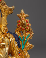 The Handmade Shyama Tara Sculpture captures the tranquil grace and compassion of the beloved Tibetan deity Tara. Standing 24.5cm tall and 21.5cm wide, this intricately made statue weighs 2.24kg and is a stunning addition to any sacred area. The statue is precisely made from copper and brass before being gently gold-plated for a rich, brilliant finish. Tara's graceful features are accentuated with vibrant acrylic colors, and the inclusion of artificial stones, such as Lapis Lazuli, Turquoise, and Coral, enhances her celestial appearance with an aura of power and protection.