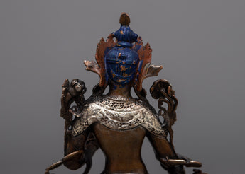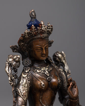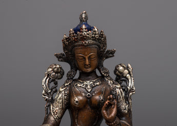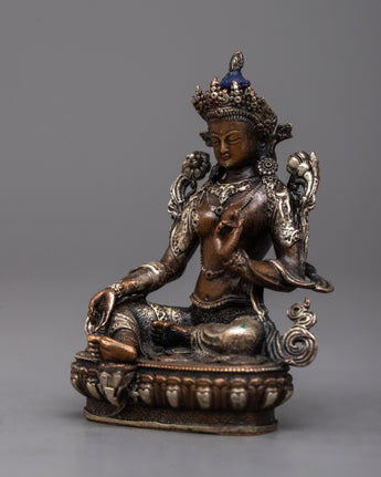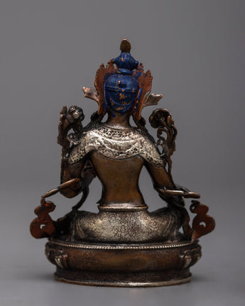 Introducing the Buddhist Machine Made Green Tara Statue, a powerful representation of emancipation and active compassion. Crafted on a copper body and delicately finished with silver plating, this 7cm tall statue captures the essence of Green Tara's protective and sympathetic character.