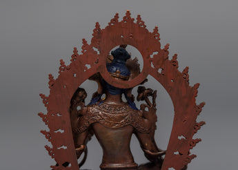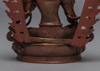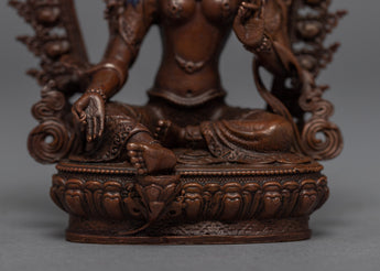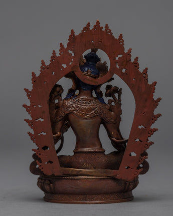 Machines were used to carve the Mini Green Tara sculpture. We used a pure copper body, which was then covered in 24k genuine gold leaf. The hand-applied acrylic paint further highlights the carvings on the figurine. The deity is serenely perched on a moon disc lotus, his face serene. Green Tara, the supreme deity, guides lost and confused souls back to their original condition. The statue's small size makes it convenient to transport while engaging in frequent meditation practices.