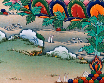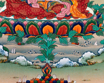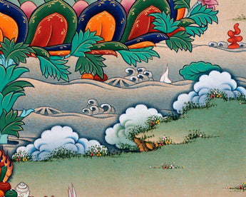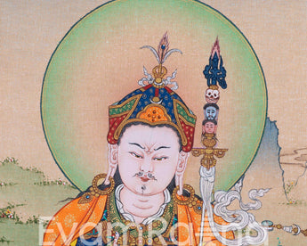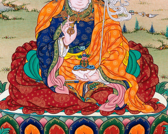 A high-quality thangka digital print of Guru Rinpoche, the "Lotus-Born" guru of Tibetan Buddhism, is exclusive to the Guru Rinpoche Empowerment practice. This poster expertly captures the essence of Guru Rinpoche's spiritual strength and presence with its rich color palette and meticulous detail. Every element of the iconography, from his serene expression to the twirling patterns on his robes, is filled with symbolism and significance. For his teachings on compassion, wisdom, and the road to enlightenment, Guru Rinpoche is beloved by many practitioners as a source of inspiration and direction. This poster will likely provide joy and significance to your home or shrine, whether you want to strengthen your spiritual practice or simply admire the beauty of sacred art.