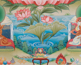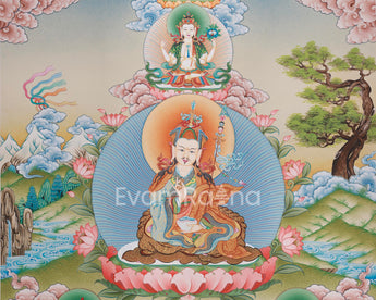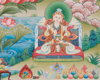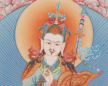 Our detailed and vibrant Guru Rinpoche, Padmasambhava Canvas depicts the enlightened master seated on a lotus, symbolizing purity and transcendence. The artwork was created using Giclée printing on high-quality cotton canvas, and it captures the intricate elements and vibrant colors of the original Thangka design. The canvas's textured surface adds depth and a natural feel, enhancing the visual appeal and creating a peaceful atmosphere in any space. This piece, available in custom sizes, is ideal for meditation areas, living rooms, or offices, providing a peaceful and reflective presence.