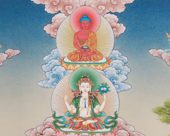 Guru Rinpoche sits on a lotus seat in the center, symbolizing his enlightened status. Chenrezig, who stands for broaden compassion, is depicted directly above him in a four-armed form. Amitabha Buddha appears at the top of the composition, representing infinite light and the essence of dharma. Various Buddhist masters are depicted below Guru Rinpoche, symbolizing the continuation and transmission of Buddhist teachings down through generations. This arrangement emphasizes the interdependent nature of key Buddhist figures, as well as the spiritual lineage established by Guru Rinpoche in Tibet.