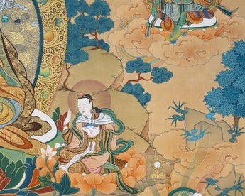 Guru Rinpoche is not only a fully enlightened Buddha, but he has also manifested as one of the greatest sages of the Vajrayana Buddhist world. He was born miraculously and served infinite beings for millenniums through the power of his wisdom and compassion. He manifested Zangdok Palri Pureland and remains there in the body of light.