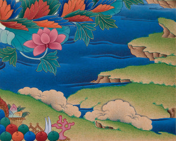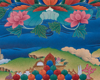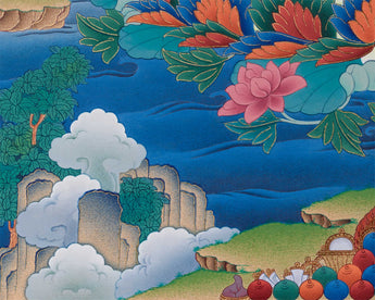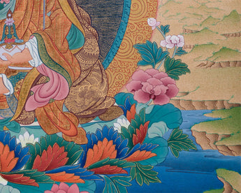 The Guru Rinpoche Thangka Print for Spiritual Connection serves as a profound conduit for seekers on the spiritual path, offering a direct link to the enlightened presence of Padmasambhava, also known as Guru Rinpoche. This sacred artwork portrays Guru Rinpoche in a state of serene meditation, radiating divine grace and boundless wisdom. Each brushstroke and detail of the Thangka print invites viewers into a realm of deep spiritual connection, fostering a sense of reverence and awe. As practitioners engage with the image, they are drawn into a sacred space where barriers dissolve, and the luminous presence of Guru Rinpoche becomes palpable. Through contemplation and devotion, individuals can cultivate a profound spiritual connection with Guru Rinpoche, accessing his guidance and blessings on the journey toward enlightenment. Displaying this Thangka print in homes and meditation spaces serves as a powerful reminder of the limitless potential for spiritual growth and transformation inherent within each being.