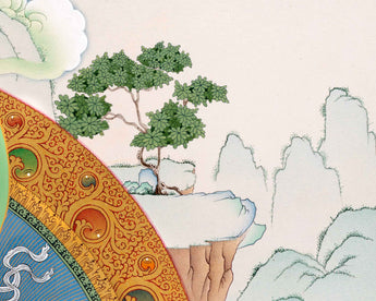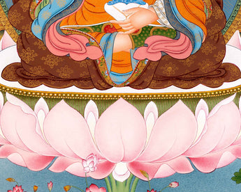 This is the thangka print of Guru Rinpoche, who is depicted sitting atop a moon disc lotus seat. The vibrant green halo illuminates his face while the blue nimbus engulfs him. Deity is portrayed beneath the beautiful rolling clouds surrounded by the exquisite lotus flowers on the water. This high-quality print will be a tremendous gift for a practitioner like you.