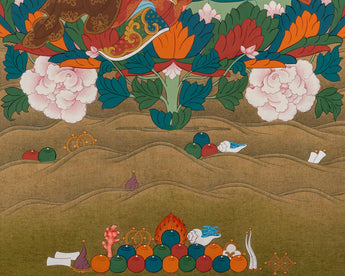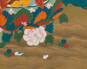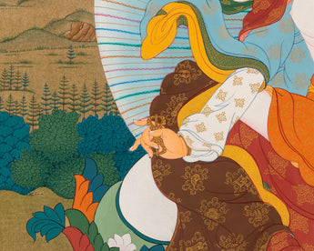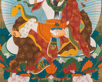 A masterpiece of Padmasambhava painting, our Guru Rinpoche with Consort Giclee Print will elevate your spiritual space. Every aspect of this painstakingly created artwork radiates knowledge and compassion, perfectly capturing the heavenly essence of Guru Rinpoche and his spouse.
