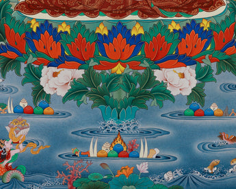 Guru Tsokye Dorje is depicted seated on a lotus throne above a sacred lake, symbolizing his miraculous birth from Dhanakosha Lake. The surrounding landscape of water, lush greenery, and divine beings signifies the harmony between the spiritual and natural worlds. The sacred elements within the painting enhance spiritual awareness and the journey toward enlightenment. In his right hand, he holds a vajra, symbolizing wisdom and the power to overcome negativity. In his left hand, he holds a skull cup filled with amrita, which represents the transformation of suffering into realization and bliss. A khatvanga staff, adorned with a vajra, trident, and three heads, signifies his mastery over birth, life, and death and his connection to wisdom.