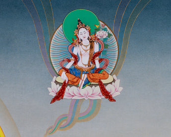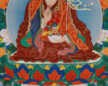Flanking Guru Tsokye Dorje are two significant Dakinis, Mandarava and Yeshe Tsogyal, seated on lotus thrones. Mandarava symbolizes longevity and pure insight, while Yeshe Tsogyal represents spiritual realization and devotion. Their presence emphasizes the union of wisdom and compassion, which is essential for enlightenment. Above him, Amitabha Buddha is depicted, reinforcing his connection to divine wisdom. This artwork serves not only as a visual representation but also as a powerful meditative tool, believed to bring wisdom, spiritual protection, and the ability to overcome challenges.