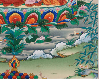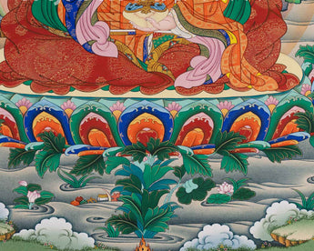 In the Mantra of Guru Rinpoche thangka print, we have portrayed Guru Padmasambhava, the Lotus Born Buddha in a tranquil state seated on a lotus seat, holding a vajra in his right hand and a skull cup in his left. He dons a white inner garment, symbolizing the brightness of his mind, and a brown outer robe, representing his selflessness. The thangka captures the beauty of the natural landscape, with verdant hills and streams cascading down towards a serene lake. In the water, vibrant lotus flowers bloom, including a grand lotus that serves as the Guru's throne. The color combination in this print is stunning. This thangka print will be a perfect gift for a practitioner like you to practice daily meditation, Buddhist rituals, and ceremonies.
