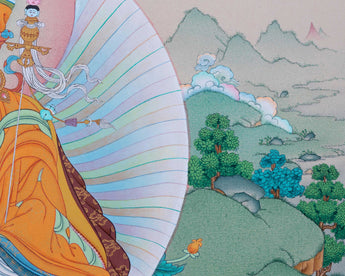 The Padmasambhava Meditation Thangka Print captures the profound essence of Guru Rinpoche, also known as Padmasambhava, a revered figure in Tibetan Buddhism. This exquisite artwork depicts Padmasambhava in a state of deep meditation, radiating tranquility and spiritual wisdom. Seated in the vajra posture upon a lotus throne, Padmasambhava embodies the qualities of enlightenment, compassion, and boundless wisdom. His presence exudes a sense of serenity and inner peace, inviting viewers to connect with the profound teachings of Tibetan Buddhism and embark on their own spiritual journey. The intricate details and sacred symbols depicted in the Thangka serve as visual aids for meditation, offering practitioners a focal point for deepening their practice and cultivating inner awareness. Displayed in homes, meditation spaces, or temples, the Padmasambhava Meditation Thangka Print serves as a powerful reminder of the transformative potential of meditation and the timeless wisdom of the Lotus-Born Master.