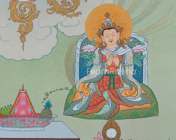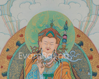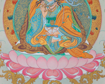 The Thangka Print of the Great Teacher, Guru Rinpoche, captures the essence of Padmasambhava, the revered figure credited with bringing Buddhism to Tibet. Known as the Lotus-Born Master, Guru Rinpoche is depicted in a state of serene contemplation, emanating wisdom and compassion. Clad in richly adorned robes and seated upon a lotus throne, he exudes an aura of divine presence and spiritual authority. With one hand raised in a gesture of teaching and the other holding a vajra, symbolizing skillful means, Guru Rinpoche embodies the union of wisdom and compassion. This Thangka Print serves as a potent symbol of spiritual guidance and empowerment, inspiring practitioners to connect with the teachings of Guru Rinpoche and embark on their own path of enlightenment. Displayed in homes, meditation spaces, or temples, it serves as a reminder of Guru Rinpoche's transformative presence and his teachings of liberation and compassion.