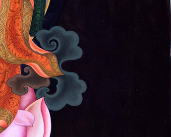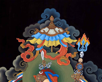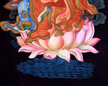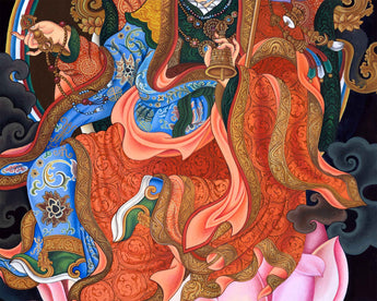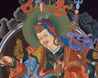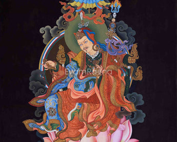Guru Rinpoche Puja is a sacred ritual performed to honor and seek blessings from the revered teacher, Guru Rinpoche. The high-quality giclee print of Guru Rinpoche depicts his majestic form in vibrant hues and intricate details. With his serene gaze, he emanates a divine aura, and his physical attributes symbolize his mastery over the elements. His lotus seat represents enlightenment, while his vajra and bell signify wisdom and compassion. This exquisite thangka is a powerful tool for meditation and spiritual growth, and its stunning beauty adds a touch of elegance to any room. Bring the blessings of Guru Rinpoche into your home and enhance your spiritual practice with this exceptional work of art.