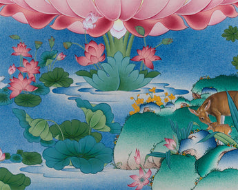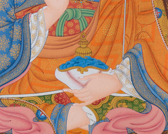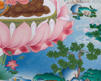 The Traditional Padmasambhava Thangka Print encapsulates the profound spiritual legacy of Guru Rinpoche, also known as Padmasambhava, within Tibetan Buddhism. Crafted with intricate detail and vibrant colors, this sacred artwork depicts Padmasambhava in his iconic form, seated majestically upon a lotus throne amidst a radiant mandala. His serene countenance exudes wisdom and compassion, while his symbolic attributes, such as the vajra and skull cup, represent his mastery over spiritual obstacles and his ability to transmute negativity into wisdom. Displayed in homes, monasteries, or meditation spaces, this Thangka print serves as a potent source of inspiration and guidance for practitioners on the path to enlightenment. Padmasambhava's blessings and teachings continue to resonate through the ages, offering solace, protection, and profound spiritual transformation to all who connect with his divine presence through this sacred artwork.