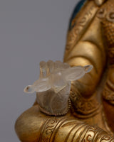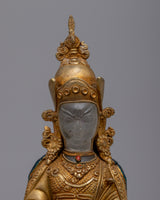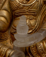 The exquisitely crafted Crystal Guru Rinpoche Statue is a stunning representation of spiritual reverence. This 23.5-cm-tall statue is skillfully crafted by hand using a blend of copper and crystal, smoothly merged to produce an alluring visual and spiritual presence. Its copper body, enhanced by electro gold plating, exudes a sense of refinement and heavenly significance.