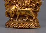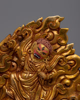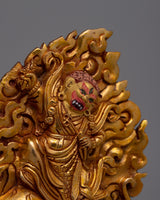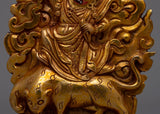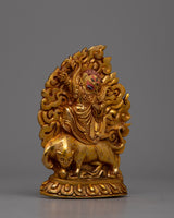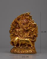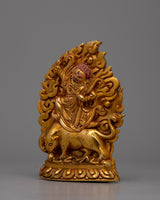 The statue's copper body, which was crafted with great care and attention to detail, is plated in electro gold to improve both its endurance and visual appeal. The image of Guru Dorje Drolo, who is highly regarded in Tibetan Buddhism for his combination of compassion and anger, has complex traits and symbolic characteristics that are consistent with his spiritual teachings.