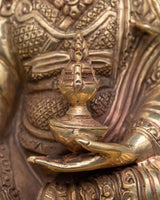 Crafted from copper, this finely sculpted statue of Guru Rinpoche, also known as a Buddhist tantric deity, stands 24.5cm tall and 15.5cm wide. Weighing 1.32kg, it is a significant spiritual art piece to add to your home altar, meditation space, or yoga studio. The elaborate patterns on his regal hat and the semi-wrathful expression on his face make this sculpture a focal point for spiritual inspiration and devotion.