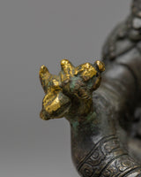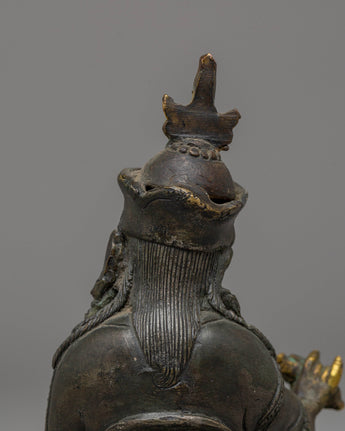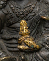 The statue's every detail, including the elaborate designs on Guru Rinpoche's robes and the accurate portrayal of his defining characteristics, has been carefully crafted. The sculpture has been given elegance and spiritual meaning by the artists' thorough attention to detail. The oxidized finish displays the skill of the artisans while also signifying the profundity and wisdom of Guru Rinpoche. For those looking for a work of art that captures the spirit of enlightenment and spiritual transformation, this statue is perfect.