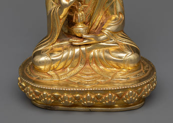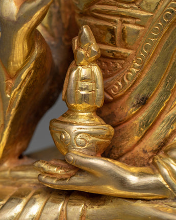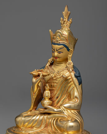 Despite its modest size, this Guru Rinpoche Idol embodies the same spiritual magnitude as larger representations, featuring the revered master in his iconic pose, holding the vajra and a skull cup, symbolizing his mastery over the esoteric teachings of Vajrayana Buddhism. The 24K gold gilding highlights the divine nature of Guru Rinpoche. At the same time, the intricate details and vibrant colors of the acrylic paintings bring to life his compassionate gaze and the symbolic attributes of his enlightened activity.
