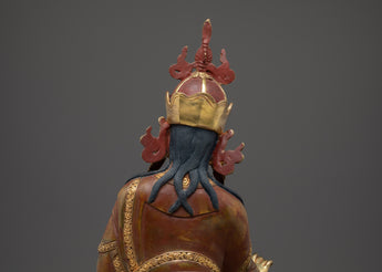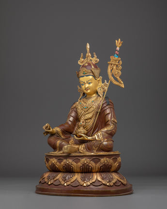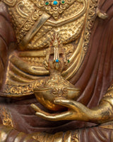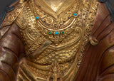 This stunning, handmade statue of Guru Rinpoche depicts the legendary Guru Padmasambhava, known as the "Lotus-Born Master" and one of the most important figures in Tibetan Buddhism. This copper body statue stands 40.5cm tall, 26cm broad, and weighs 4.43kg. It is gold-plated to showcase the enlightened master's glorious radiance. Guru Rinpoche is depicted seated in a meditative pose, clutching a vajra (thunderbolt) in his right hand, symbolizing his unwavering insight and capacity to dispel ignorance. The figure is richly detailed, with brilliant acrylic color highlights that highlight the splendor of his crown, robes, and lotus pedestal.