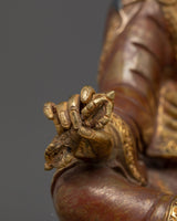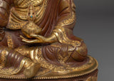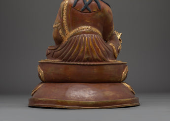 The gold-plated copper material lends the statue a timeless, spiritual quality, while the careful application of acrylic paints brings the dynamic presence of Guru Rinpoche to life. His tranquil expression and regal posture evoke compassion, wisdom, and the transformational power of spiritual practice. Whether put in your house or a meditation room, this statue exudes tranquility and serves as a reminder of the journey to enlightenment. The lotus base represents purity and spiritual growth, making it an ideal centerpiece for any Buddhist altar or sacred spot.