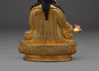 The Himalayan Golden Guru Rinpoche Art, also known as Padmasambhava, the founder of Tibetan Buddhism, represents enlightenment, compassion, and spiritual mastery. This handcrafted statue is 6.3" (Height) x 4.1" (Base) and weighs 0.65 kg. It is made of solid copper, adorned with 24K gold gilding, and enhanced with detailed gold and acrylic paints. Created by expert Nepalese artisans, it represents Himalayan Buddhism's holy traditions, making it an appealing addition to altars, meditation places, or sacred collections.