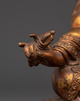 The statue measures 24 cm in height, 15 cm in width, and weighs 1.23 kg. The figure is crafted from oxidized copper and finished with beautiful gold plating, which enhances its spiritual presence and aesthetic appeal. The statue's gold-plated finish gives it a rich, brilliant appearance, representing purity and enlightenment. At the same time, the oxidized copper base lends a traditional, classic touch that complements any Tibetan Buddhist collection or home decor.