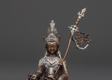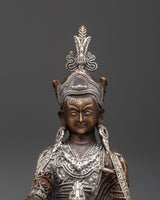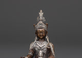 This Guru Rinpoche—Padmasambhava statue, renowned as the Second Buddha and creator of Vajrayana, represents tremendous spiritual mastery. This oxidized copper Guru Rinpoche statue stands 11 cm tall and 8 cm wide, weighing 0.15 kg. The elaborate silver plating showcases the rich decorations on his garments, crown, and ceremonial tools. The artistry shows Guru Rinpoche's spiritual intensity and calm while reclining on a lotus base.